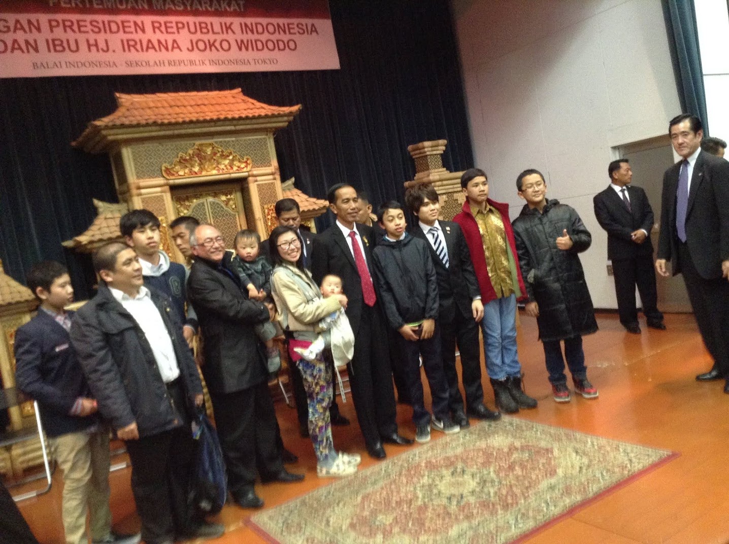 Foto di atas adalah foto istri dan anak saya tepat di samping Jokowi saat Jokowi melakukan kunjungan ke Jepang tahun 2015. Mana saya? Ya yang memfoto, karena saya tidak suka nebeng foto bareng orang terkenal. Nah, yang lainnya rapi berjas hitam, istri saya santai menggendong anak dengan jaket musim dingin - dan semua balita yang nampak di foto ini adalah anak-anak saya. Ini salah satu pengalaman as a family yang kelak bisa sama-sama kami ceritakan ke anak-cucu.